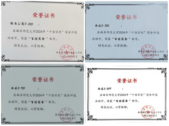 学子表现优异,共有五个宿舍获奖:其中西校区5号楼116宿舍荣获校级“十佳宿舍”称号、西校区2号楼921宿舍等四个宿舍荣获校级“百优宿舍”称号。