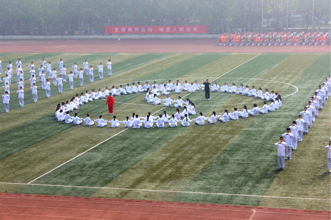 400人的太极拳方队身着白色太极服,以其整齐如一的动作引发阵阵欢呼,赢得了领导和观众的一致好评。