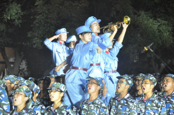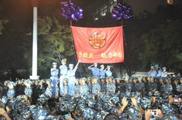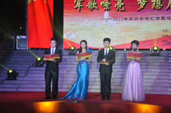 2015年军训合唱汇演暨迎新文艺晚会在孔子文化广场隆重举行。出席本次活动的领导和老师有:数学与统计学院党委副书记王作茂、团委书记刘永礼、14级辅导员杜晨曦和15级辅导员郅艳梅。