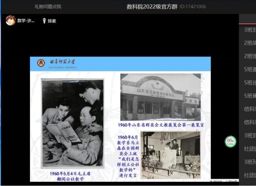 许勇军副教授带领学院2022级新生回望了六十六载曲园数学记忆。他从筚路蓝缕的办学历程、引以为傲的公社数学、兼容并包的学术交流、不忘初心的发展壮大四个方面介绍了学校数学学科的发展历程。从1956年的“建立次年曲阜安,北上南下忙招贤”到1972年的“复旦赠送 一零三,如获至宝日夜伴”,再到如今的数学与应用数学专业首批入选国家级一流本科专业建设点和信息与计算机科学专业入选山东省一流本科专业建设点,许勇军通过对学院历史的回顾,向同学们总结了“蹄疾步稳、犁牛之子”的数科人精神,并勉励同学们以老一辈数科人为榜样,锐意进取、开拓创新、注重诚信、敢争一流。