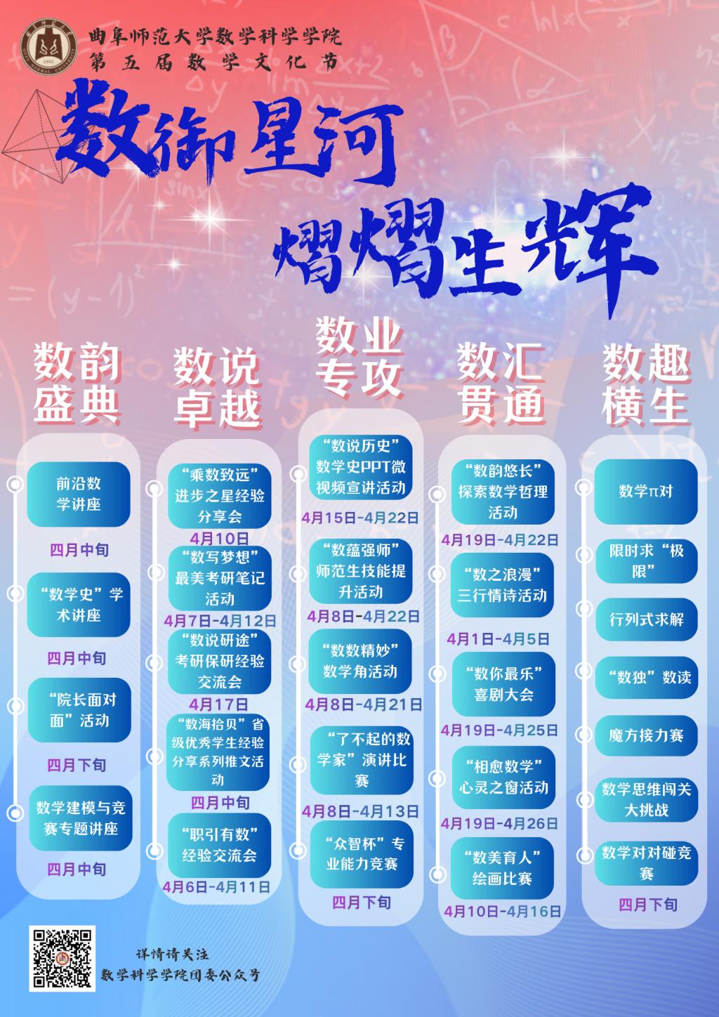 积极响应,迅速行动,启动了“曲园数学角”,开展“每日一题”和基础课程“章章通”等活动;成立了杏坛学堂卓越班,探索拔尖人才培养新模式,开启了一系列有意义的探索。本届数学文化节以“数御星河,熠熠生辉”为主题,共分为“数”韵盛典、“数”说卓越、“数”业专攻、“数”汇贯通、“数”趣横生五个主题,以服务学生成长成才为目标,以弘扬数学文化、传承数学家精神为主线,是立足数学学科特色打造的育人品牌活动。下一步,学院将进一步优化数学人才培养体系,为深入推进本科教育教学思想大讨论贡献数学力量。