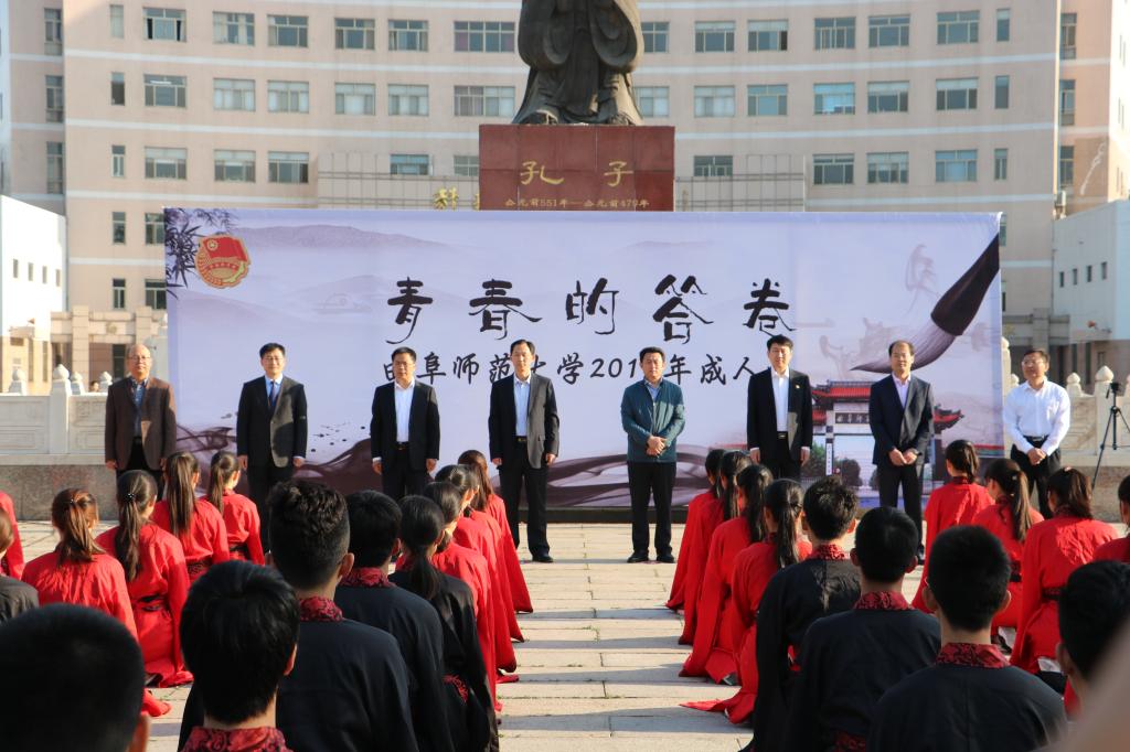 孔子文化广场,成人礼仪式正在举行,出席活动的领导嘉宾们,在孔子像前为学子们加冠加笄,以传统礼仪的方式将一份成年人的责任赋予青年,最后,在冠笄礼学子的庄严宣誓中,成人礼仪式圆满落幕。