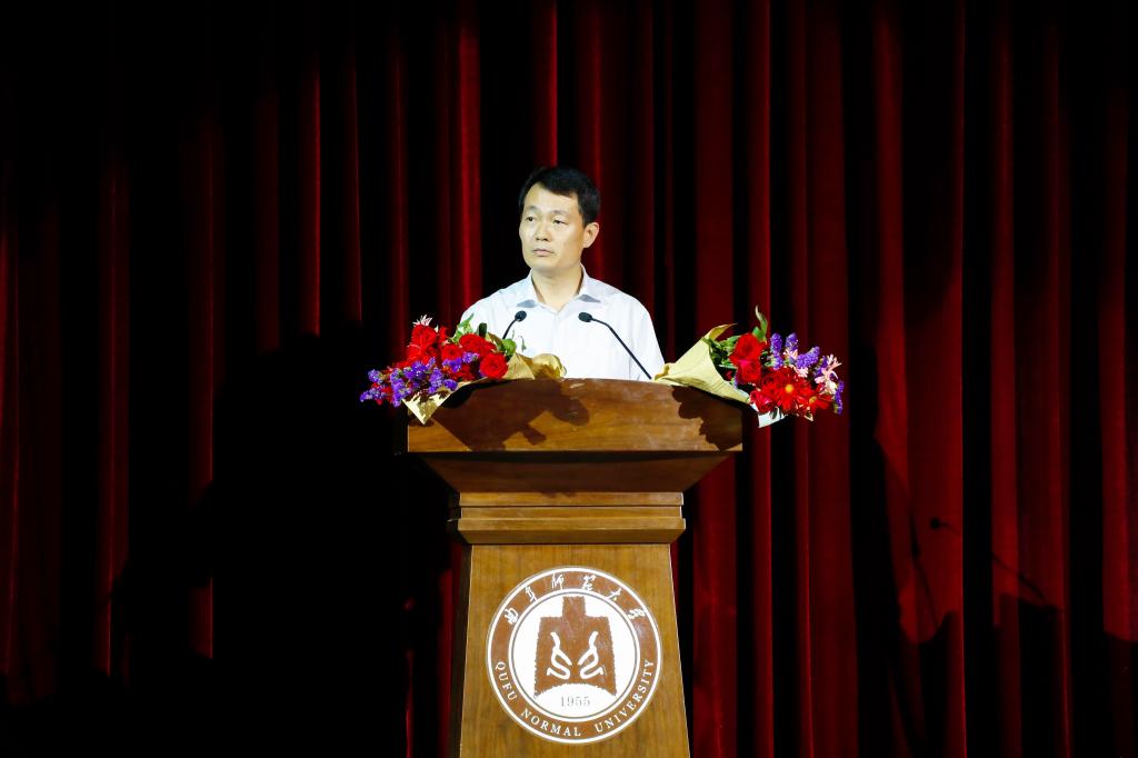 毕业生原创视频《万万没想到》,一时间掌声、欢呼声不断,将全场气氛点燃。整场晚会内容丰富多彩,精彩不断,表演者们各展所长:舞蹈、歌曲、相声、小品,为老师和同学们带来了一场视觉与听觉的盛宴。其中2013级各班学生代表演唱的《曲师大版成都》蕴含了每一个曲园学子对曲园深深的爱意,歌曲最后王作茂、刘永礼、朱伟卫、郑召文四位老师依次上台表达了对毕业学子的祝福,这浓浓的师生之情,将晚会推向了高潮。最后,在歌曲《不说再见》的优美旋律中,全体表演者走上舞台,和大家挥手告别,晚会落下帷幕。
