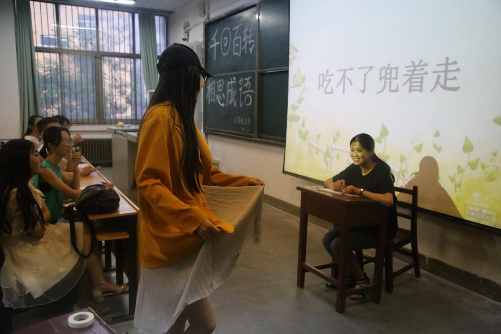本次活动通过以双人小组为单位进行报名,以成语为主题,通过你画我猜的形式比赛,在规定的三分钟内猜出成语并默写,数量多者获胜。主持人致开场词后,比赛正式开始,面对屏幕表演比划的选手手舞足蹈,展现的生动细致,负责猜出并默写的同学快速联想思考,与队友默契配合,观众们跃跃欲试,现场气氛十分热烈。