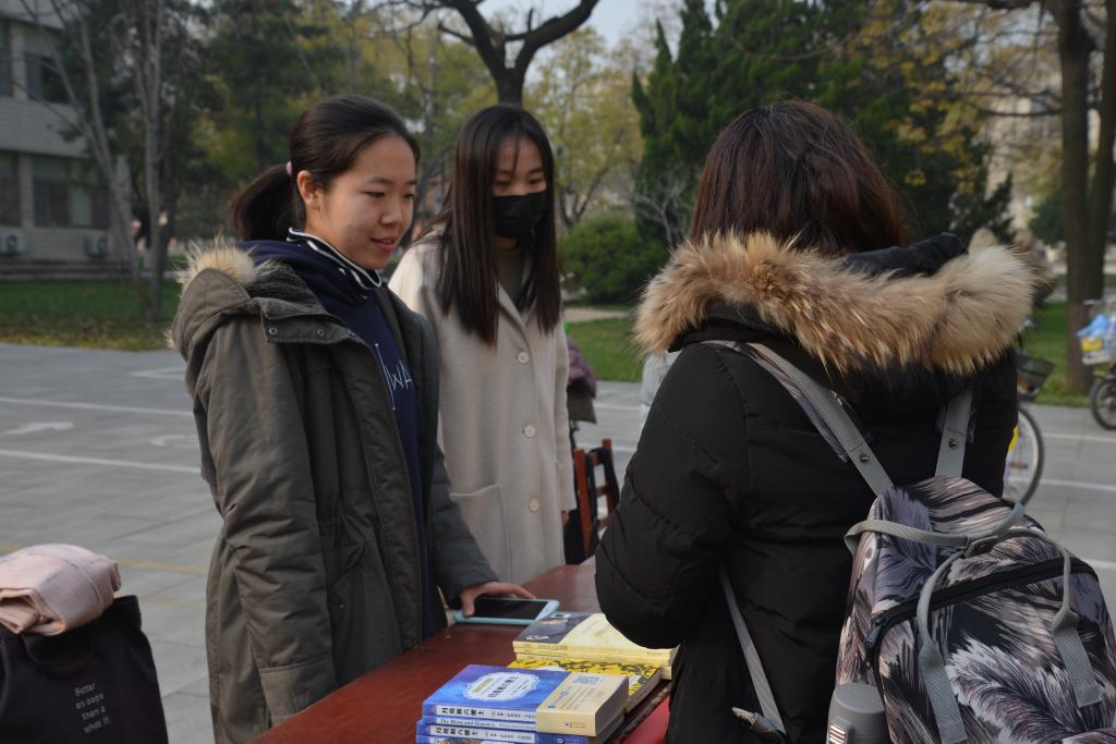 教学楼前成功举行,吸引了众多喜欢阅读的同学前来借书。
