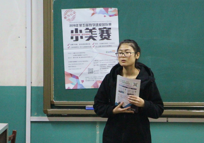 19点讲座正式开始,社团负责人王俊秀就“小美赛”的特点、数学建模的过程、参加比赛的意义等几个方面向同学们进行了详细介绍。她通过列举数学建模解决交通问题等实例向同学们展示了数学建模准备、假设、公式应用、分析和检验等几大步骤,让同学们对数学建模有了进一步的认识,从而增强了参赛兴趣和信心。参与讲座的同学们也对数学建模热情高涨,他们积极发言,踊跃提问,并及时做笔记。