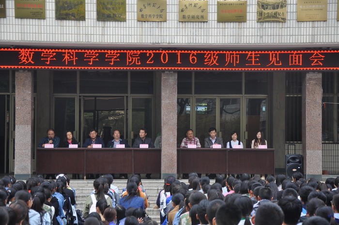 2016级师生见面会暨入学教育大会在数学教学楼成功召开。数学与统计学院党委书记王方立,院长、博士生导师孟凡伟,副院长王顶国,党委副书记王作茂,研究所副所长郑召文,办公室主任王瑾,教务员刘艳丽和2016级辅导员张惠出席了会议。会议由团委书记刘永礼主持。