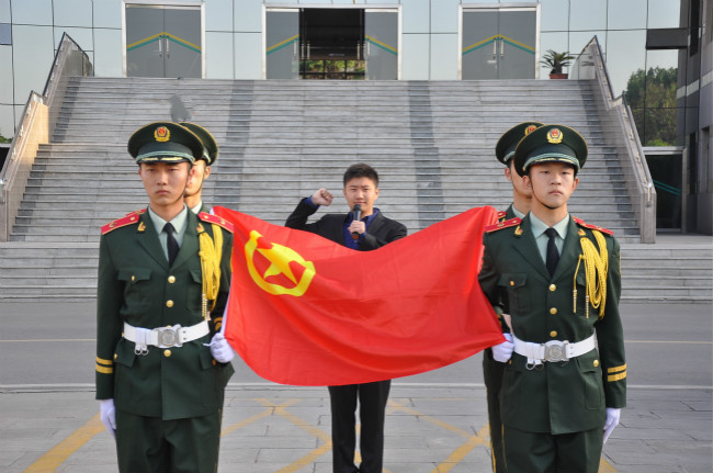 2015级全体新生齐聚在孔子文化广场,隆重举行了"迈入青春门,走好人生路"主题纪念五四运动升旗仪式。
