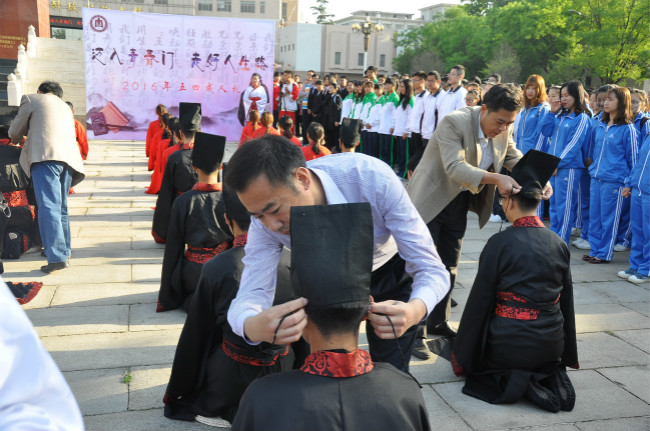 随着慷慨激昂的义勇军进行曲奏响,五星红旗缓缓升起,迎风飘扬。怀着赤诚之心的学子们举起右手庄严宣誓,洪亮的声音响彻校园。成人礼仪式上,出席大会的领导和嘉宾在孔子像前为学子加冠并送上美好祝福。仪式最后,校领导代表发表了"弘扬传统文化"主题重要讲话,激励同学们谨遵入团誓词,爱党爱国,团结奋进,做好新时代的大学生。