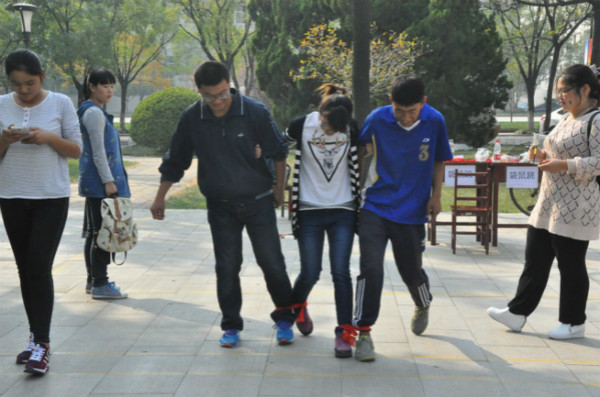 全体在校大学生展开。比赛囊括了齐心协力、投筷子、叠硬币、筷子夹玻璃球、自行车慢骑、单脚站立头顶书、跳绳、转书、顶扫把、背靠背挤气球跑、瞎子过桥等二十一个项目,种类繁多,考察的能力更是各种各样。活动现场,参加比赛的同学络绎不绝,更有一些校友旁观了比赛,欢声笑语不断,处处充满了青春与活力的活动现场,令他们想起了自己的学生时代,更勾起了他们对母校的深深眷恋。而参与了以考察团体合作默契为主的"齐心协力"项目的同学们纷纷表示通过这个游戏深切感受到了合作的重要性,并坦言在今后的生活和学习中定会更加注意合作,实现共赢,留给自己丰富、圆满的大学生活。
