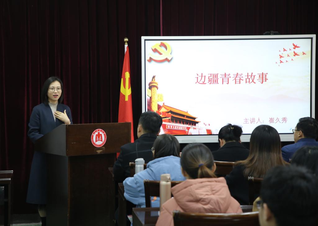 对校友崔久秀的到来表示热烈欢迎并对崔久秀的优秀事迹做了详细介绍。之后,崔久秀围绕自己的曲园求学经历、新疆工作经历、备战考研经历、北大读研经历四部分与在座的党员同志分享了自己别样绚丽的青春故事。她讲述了自己在曲园生活学习的点点滴滴,回忆起学校老师远赴新疆看望自己时的温暖与感动,牢记习近平总书记对新时代支边青年的寄语和嘱托,扎根边疆服务社会受到当地各族群众认可和支持,以及一边工作一边备战考研的艰辛与快乐和她到了北大读研以后的感想和感悟。报告鲜活生动,在全体本科生党员中引起强烈反响和共鸣,赢得了阵阵掌声。