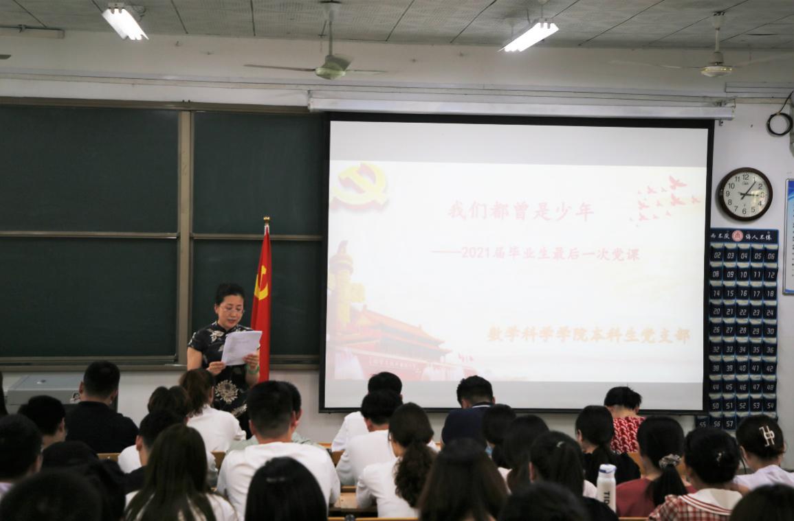 于数学楼201室组织了2021届毕业生最后一次党课。党委副书记曲凤东,本科生党支部书记朱伟卫、支部副书记杜晨曦、青年委员徐腾飞、宣传委员荣斌、学习委员韦宁、组织委员高思明出席本次活动,学院全体党员参与本次党课。本次党课由朱伟卫主持。